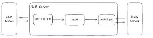 MCPClient를 이용하여 RAG Server와 상호작용하며 Agent를 통해 문서 검색 tool들을 호출하고 반환된 문서 청크들을 기반으로 LLM 응답을 생성하는 등 최종 응답 생성 흐름을 제어합니다.