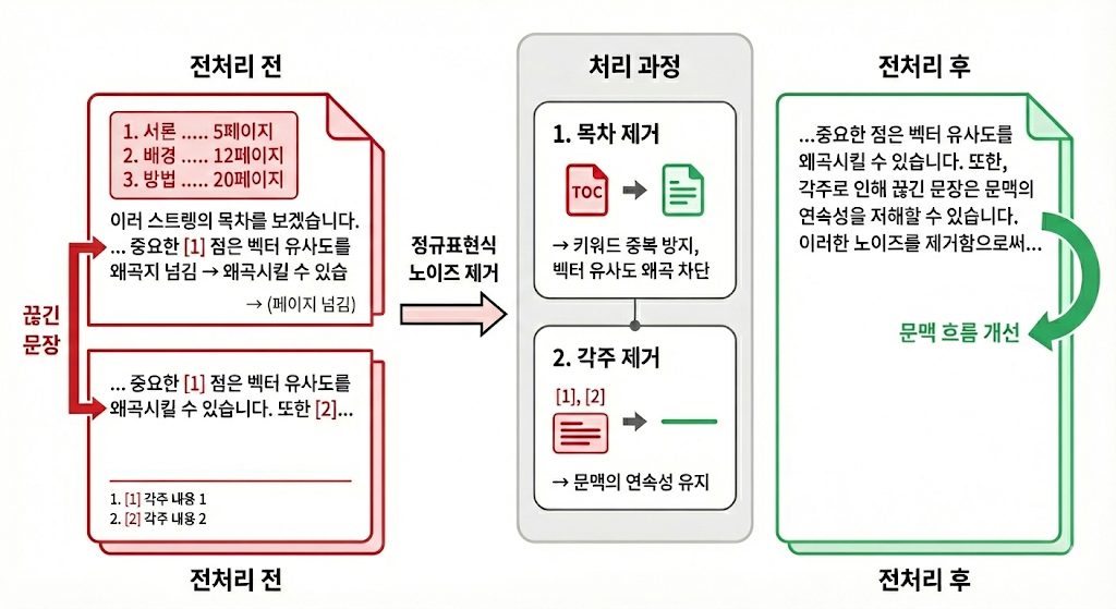 LLM은 페이지 번호만 보고 실제 위치를 찾아갈 수 없습니다. 오히려 키워드 중복으로 벡터 유사도만 왜곡시키기 때문에, 휴리스틱하게 목차 패턴을 분석하여 최대한 General한 정규표현식으로 제거했습니다. - 각주(Footnote) 제거