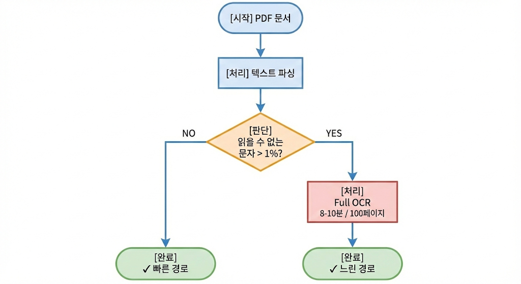 - 2차 시도 (Full OCR): 1%가 넘으면 해당 문서를 '깨진 문서'로 판단하고 문서 전체를 OCR(광학 문자 인식)을 수행하여 문자열로 변환합니다.