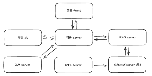 사용자는 챗봇 Front를 통해 질문을 입력하고, 챗봇 Server가 이를 처리합니다. 챗봇 Server는 대화 이력을 챗봇 DB에 저장하고, 질문에 답변하기 위해 RAG Server와 LLM API를 호출합니다.